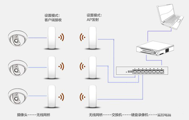 如果攝像頭比較分散,距離較遠(yuǎn),可每個(gè)攝像頭都配置一對網(wǎng)橋